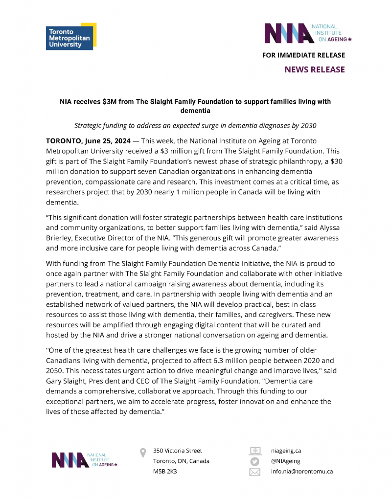 The National Institute on Ageing at Toronto Metropolitan University received a $3 million gift from The Slaight Family Foundation. This gift is part of The Slaight Family Foundation’s newest phase of strategic philanthropy, a $30 million donation to support seven Canadian organizations in enhancing dementia prevention, compassionate care and research. This investment comes at a critical time, as researchers project that by 2030 nearly 1 million people in Canada will be living with dementia.